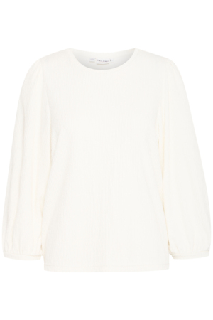 Blød bomulds T-shirt med flotte striber fra Culture. Den har rund hals og lange æmer som begge afsluttes med en feminin tulle kant. Kan kombinres med buks fra samme serie eller under fx kjoler eller til et par jeans.