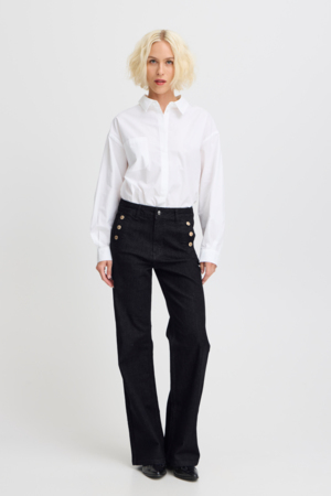 Smarte bløde og lette denim bukser. Buksen er fra Nümph og har en høj talje med vidde i benene. Der er skrå sidelommer og paspolrede baglommer. De er meget stretchy og bløde som giver en god komfort og pasform.
