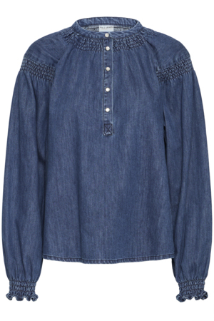 Let og behagelig Pulz Jeans skjorte. Skjoten har flotte blå nuiancer med en smal camel farvet strib. Den lukkes med flotte knapper, har krave og lange ærmer med en smal elastikkant.