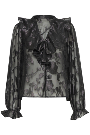 Smuk og elegant sort mesh bluse fra Culture. Blusen har en høj hals, transparente mesh ærmer samt påsyede blomster på kroppen. Brug den til et pa sorte buksker for et sofistikeret look.