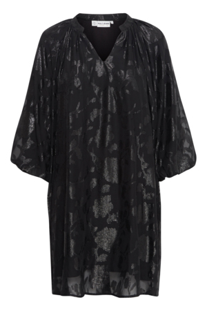 Smuk Culture kjole med et flot sort blad print. Kjolen har et løst flatterende ærme, en fin v-udskæring og lommer i siden. Den har en begalig pasform og er knælang.