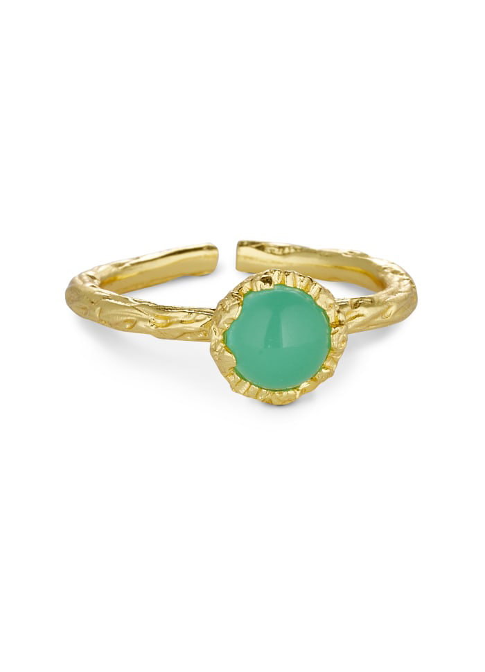 Smuk guld fingering med en lidt grov struktur og en sart rosa natur sten. Rinegen kan justeres efter tykkelse på finger. Pure By Nat laver deres produkter af genanvendt messing som derefter er håndyppet i først 1 gang sterling sølv også 2 gange i 24" genanvendt guld.