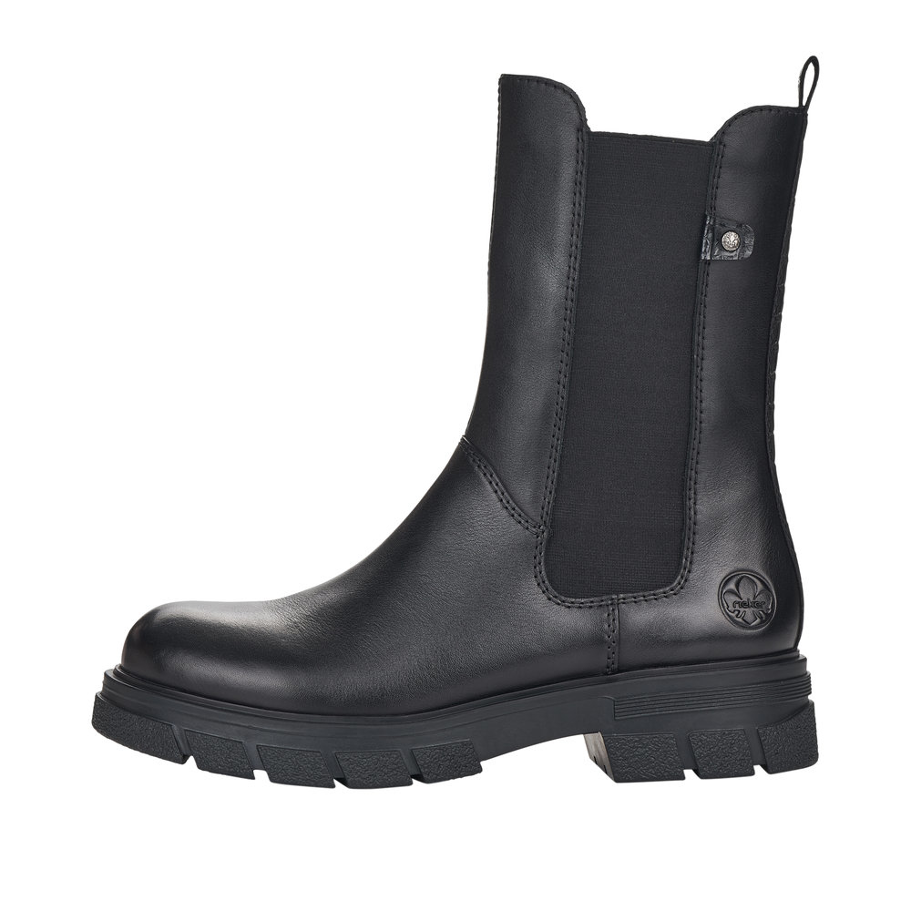 Håndlavet støvle, udført i sort lakeret skind med rund tå. Støvlen har elastiske sidepaneler og er dekoreret med en strop bagpå i sort præget skind med slangeskindsstruktur.