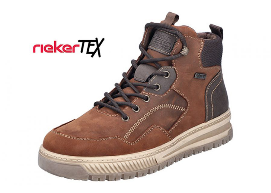 En flot Rieker støvle til herre i brun. Støvlen er med fine detaljer langs siden og bagpå samt en mørkere nuance på snuden, der giver et smart touch. Støvlen lukkes med lynlås i siden og snørres.