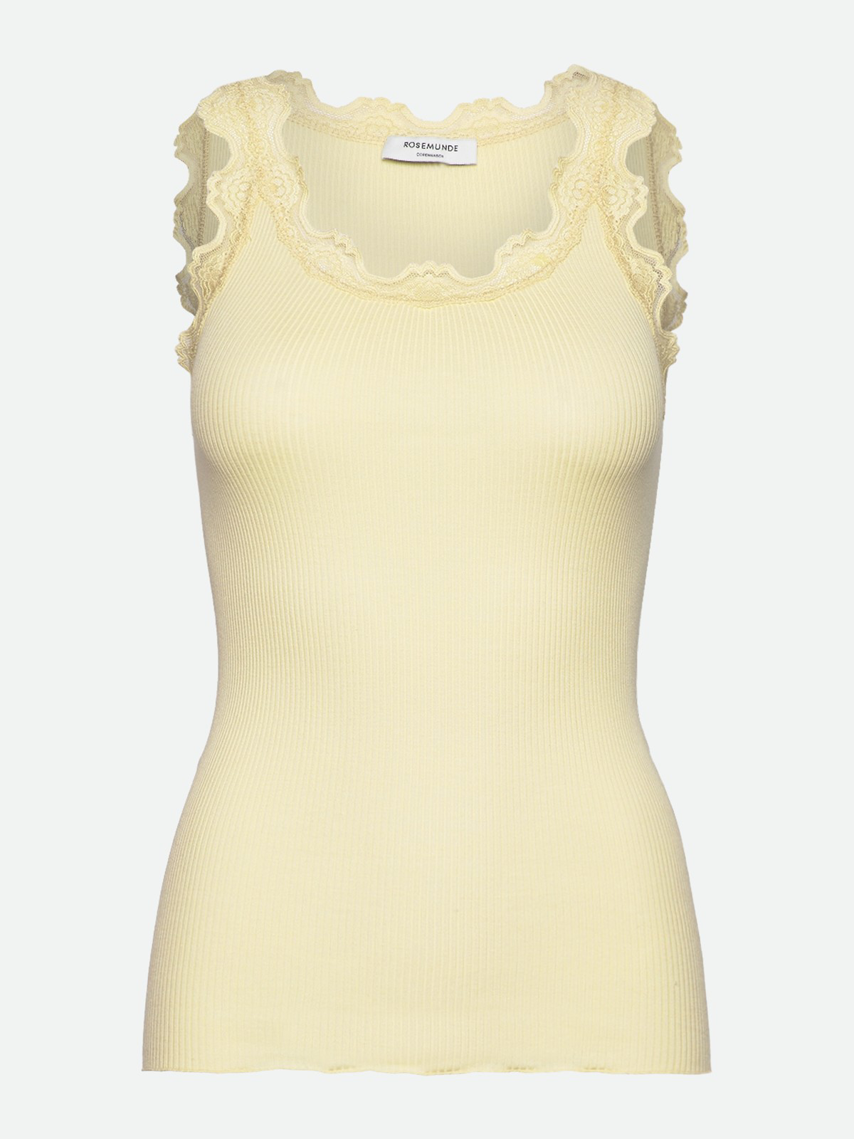 Rosemunde's ikoniske silke top med blonde kant er uundværlig i basic garderoben. Nu i en ny flot farve.