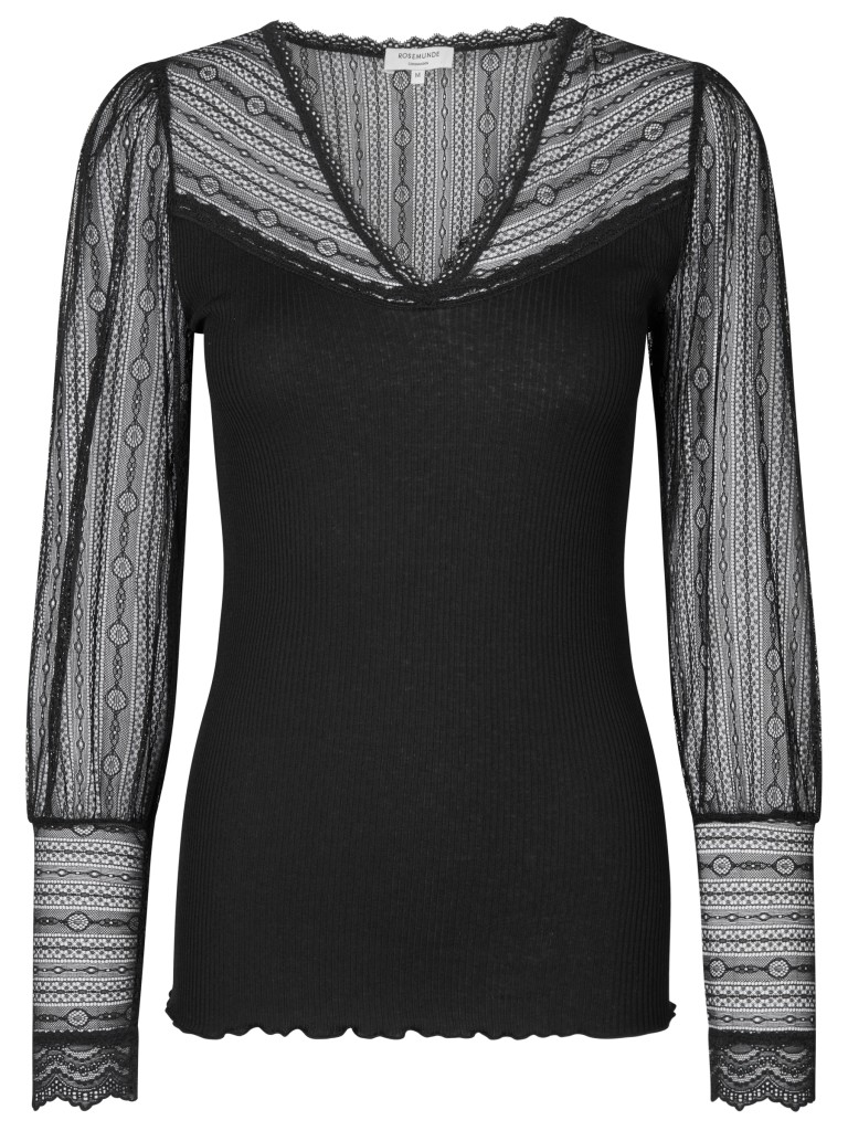 Super smuk bluse/T-shirt fra Rosemunde med rib, blonder og i den skønneste silke kvalitet. Styles fx med et par jeans og med en strik/Skjorte eller blazer til.