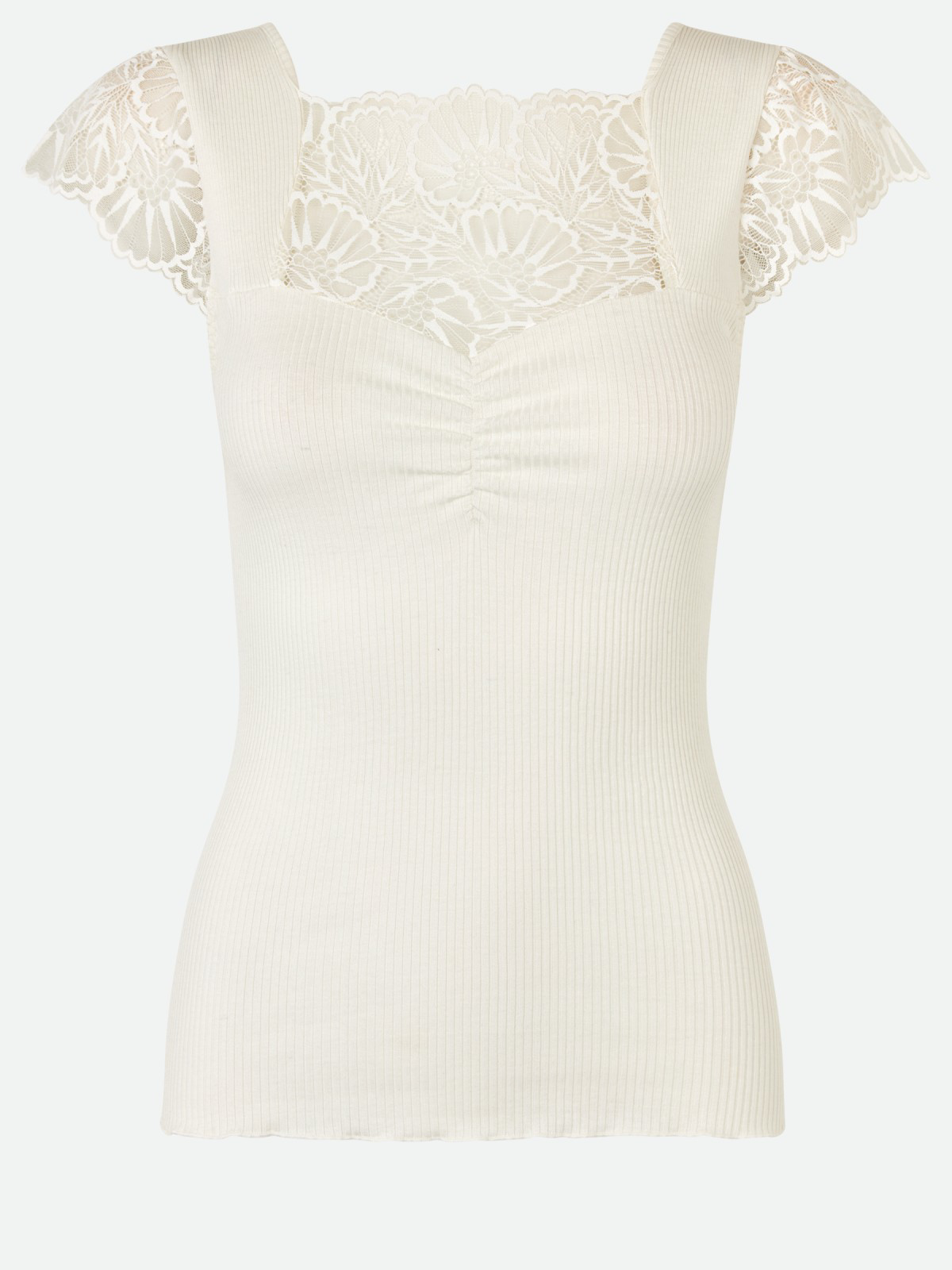 Super smuk og feminin Rosemunde T-shirt. T-shirten har en smuk blondedetalje udover skulderen og i halsudskæringen. Ryggen er dyb med en flot firkantet udskæring.