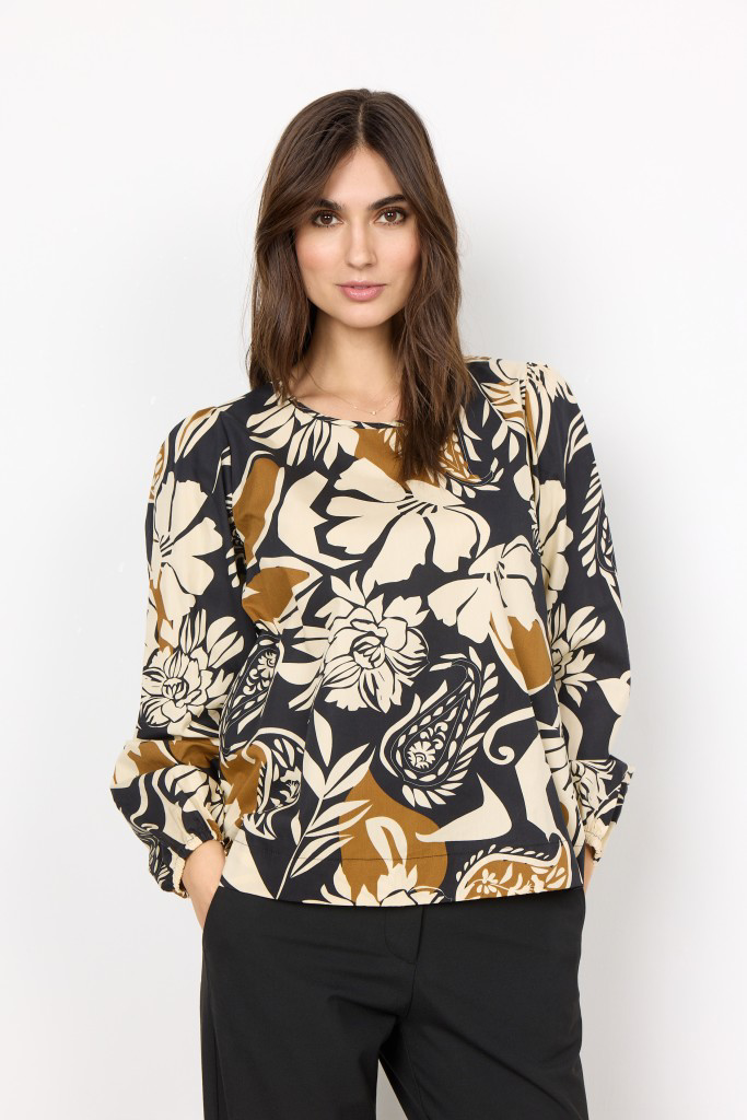 Flot bomuldsblusemed blomsterprint i lyse og brune nuancer