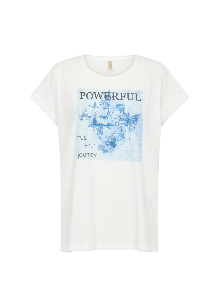 Fin afslappet bomulds T-shirt fra Soya Concept. Den har korte ærmer, rund halsudskæring og et fint frontprint. Pasformen er løs og der er en lille slids i begge sider.