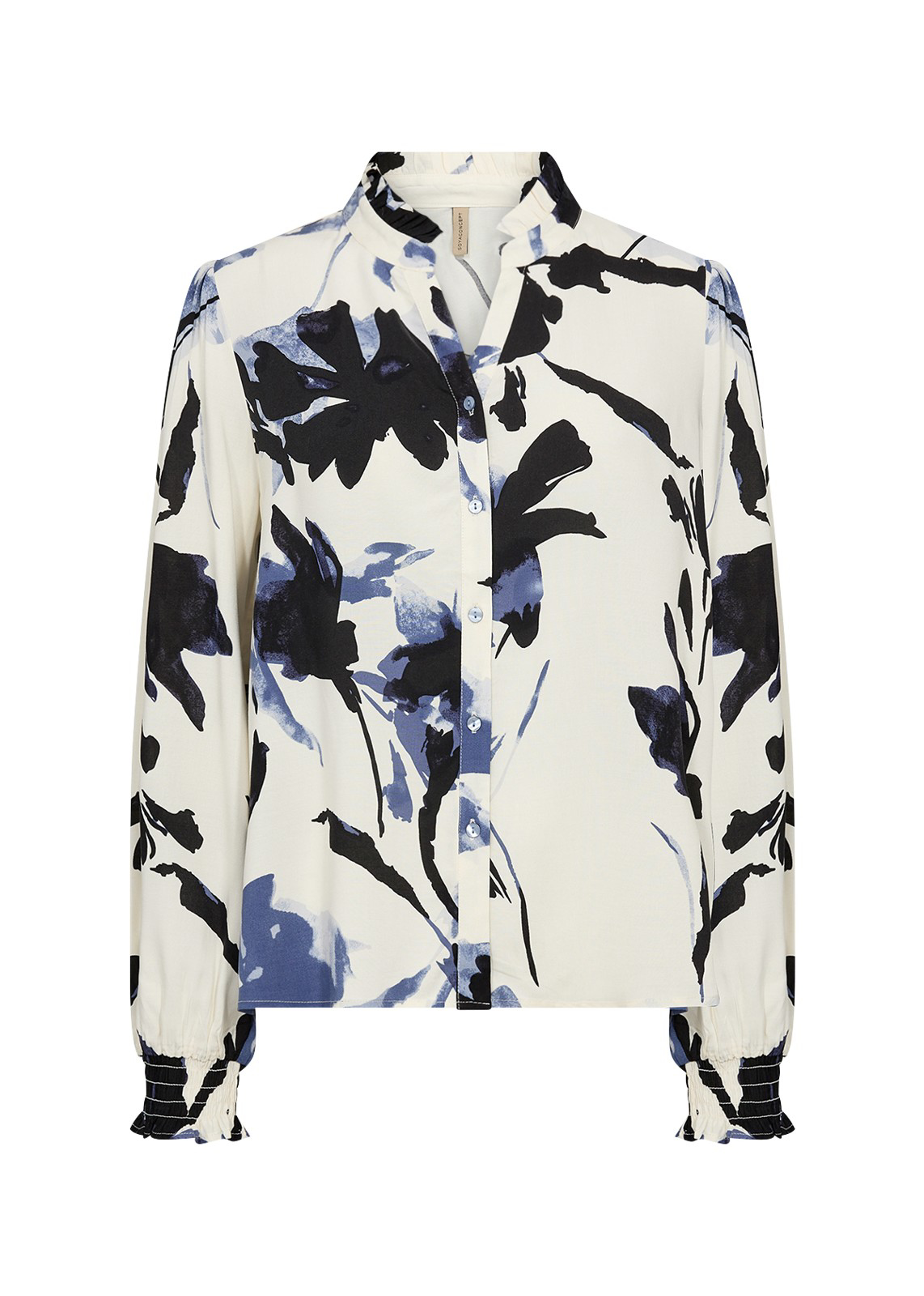 Frisk og feminin skjorte fra Culture. Skjorten har flotte lyseblå striber med et dekorativt blomsterprint i blå og mørke nuancer. Den har lange ærmer med manchet, en klassisk krave og dobbeltradet knaplukning. Pasformen er rummelig og kort.