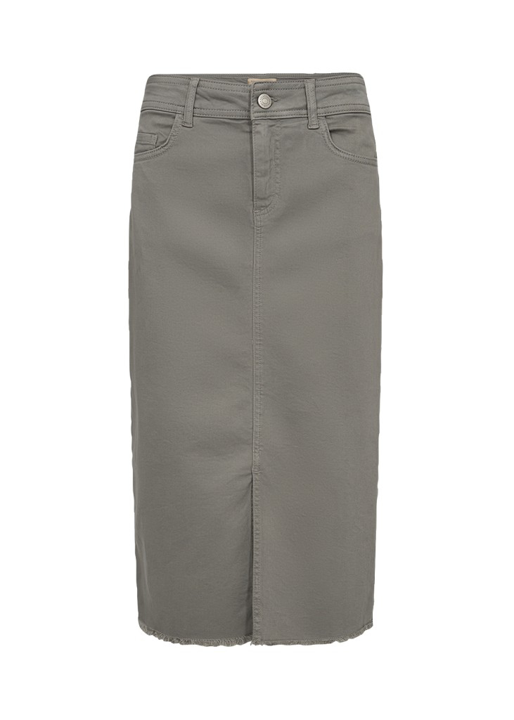 Skøn nederdel fra Soya Concept med et klassisk 5 lommet design. Nederdelen har en midilængde, kort slids foran og en rå kant nederst.