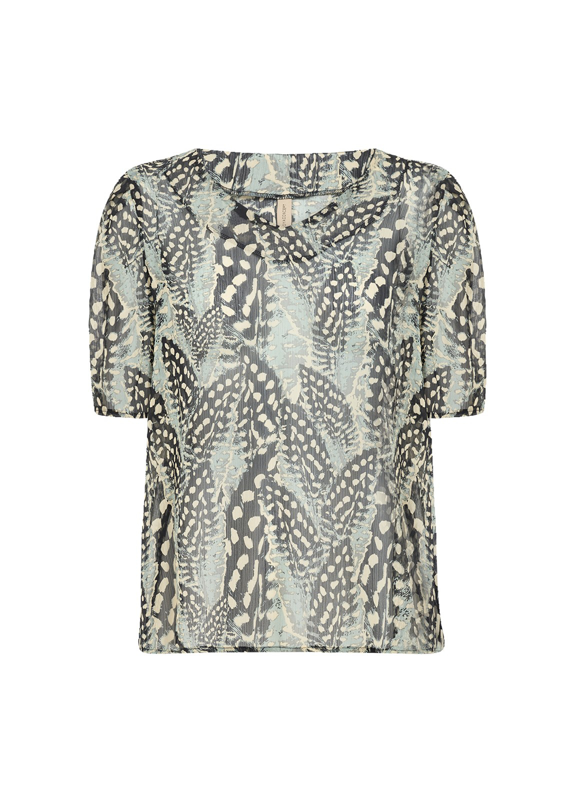 Super let bluse fremstillet af 100% genbrugspolyester. Toppen har mellemlange ærmer, V-udskæring og er i et unikt printdesign. Den kan bruges som et afslappet item sammen med jeans eller skræddersyede bukser.