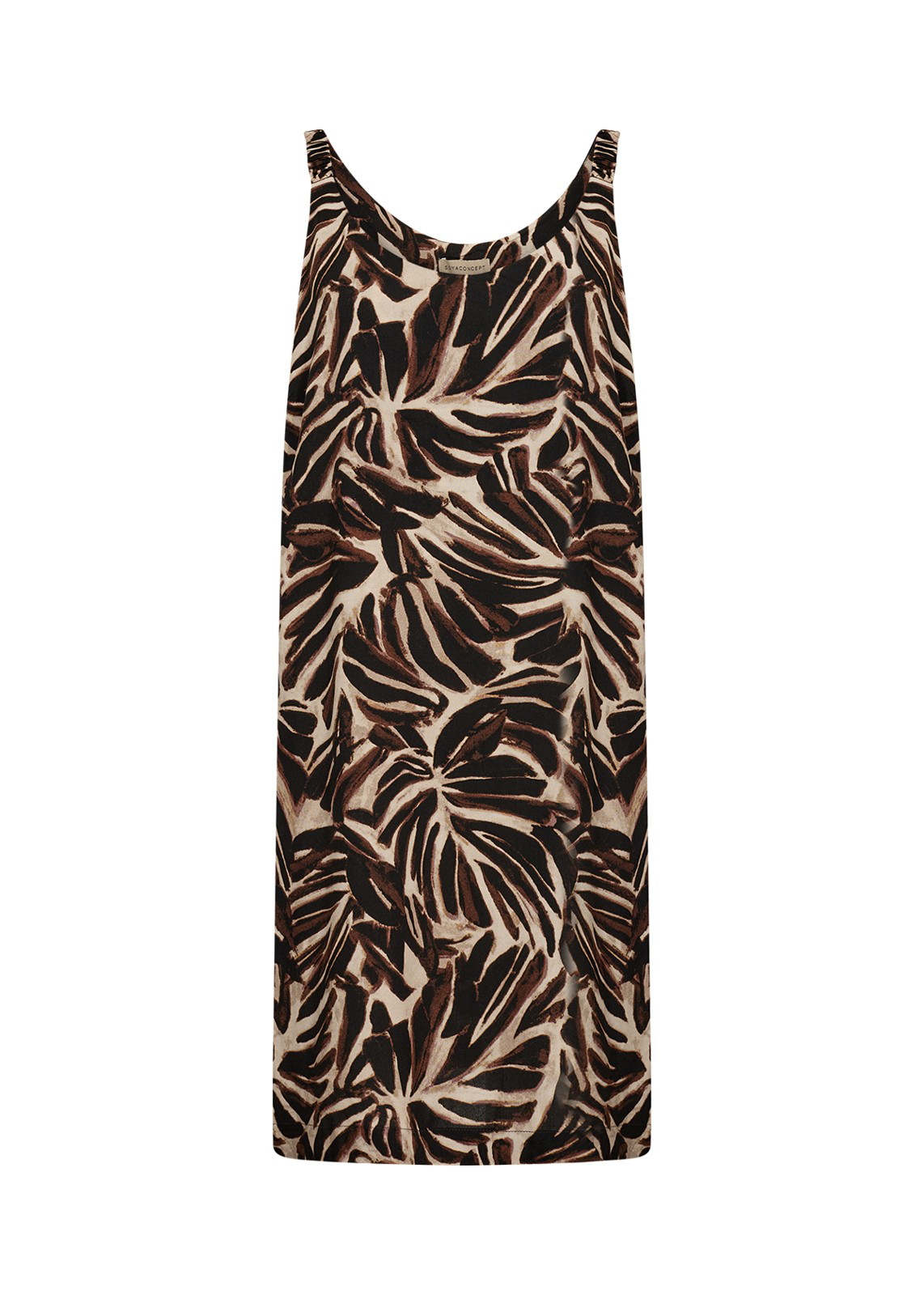 Behagelig Soya Concept kjole i en blød viskose kvalitet. Kjolen er ærmeløs med smalle stropper og har en knæ lang længde. Den har et flot eksotisk blad print.
