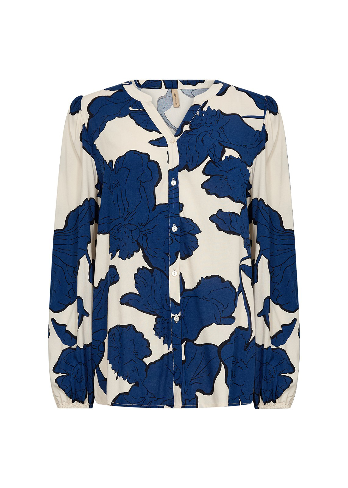 Feminin viskose bluse fra Soya Concept. Blusen har v-udskæring og lange ærmer med smock manchetter. Pasformen er løs og der er smockkant nederst på blusen. Farverigt og livligt print i 2 farver.