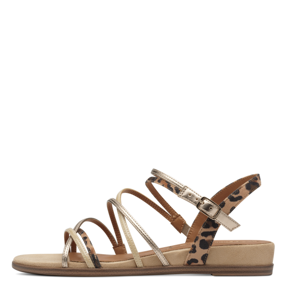 Super flot Ecco sandal på kilehæl i guld, som er fremstillet af blød børstet nubuck-læder og har en enkel bred rem over foden og en justerbar ankelrem. Let PU-ydersål giver stødabsorbering og fleksibilitet ved hjælp af innovativ ECCO FLUIDFORM Direct Comfort-teknologi.