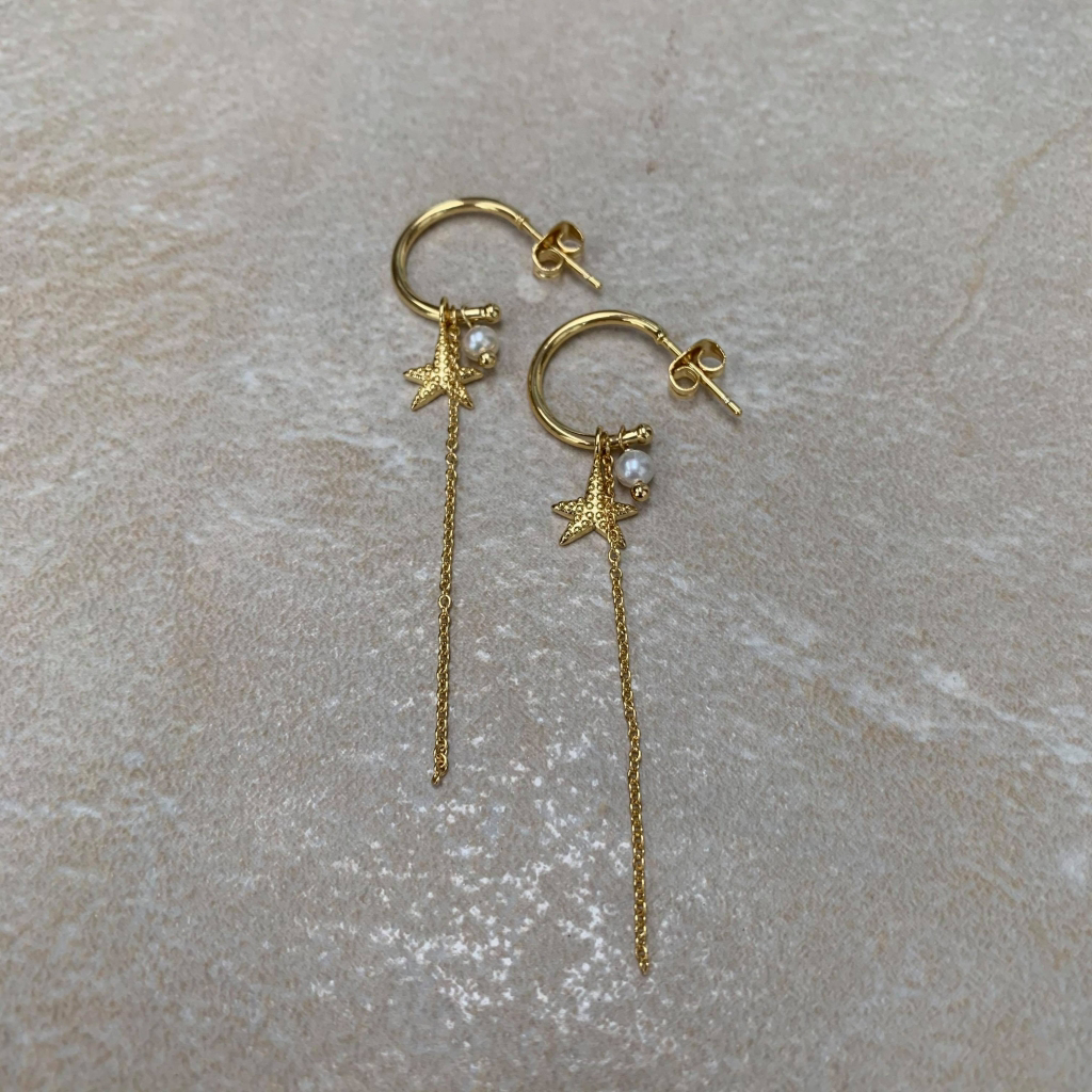 uper smukke og dekorative Cammi creoler fra Pure By Nat. De har kæder, ægte ferskvandsperle, rosa kvarts og grøn onyx. Øreringene er belagt med 24K guld og låser sig sikkert og komfortabelt om dit øre.