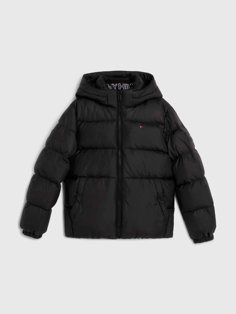 Flot Tommy Hilfiger jakke i navy til dreng. Den åbnes med lynlås og har en høj hals, hvor der er en hætte, som kan foldes ud. Jakken har en skrå lomme i hver side med trykknapper.
