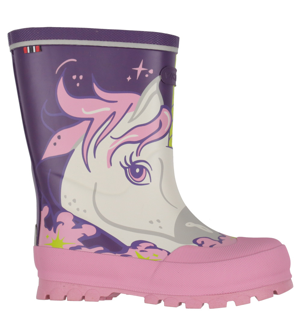 Fine Viking gummistøvleri støvet rosamed et hvidt logo på ydersiden. Gummistøvlen har et lille refleks på hælen. Gummistøvlen er i naturgummi med en robust gummisål med groft mønster, der gør at dit barn står fast i regnvejr. Støvlen har bred nylonkant, der kan snøres ind til benet. Gummistøvlen er foret med tekstil og der er en blød, behagelig udtagelig sål.